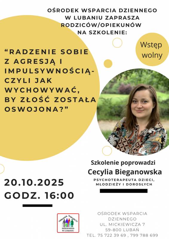 Zapraszamy serdecznie wszystkich rodziców/opiekunów na bezpłatne warsztaty w Ośrodku Wsparcia Dziennego - "Radzenie sobie z agresją i impulsywnością, czyli jak wychowywać, by złość została oswojona?".